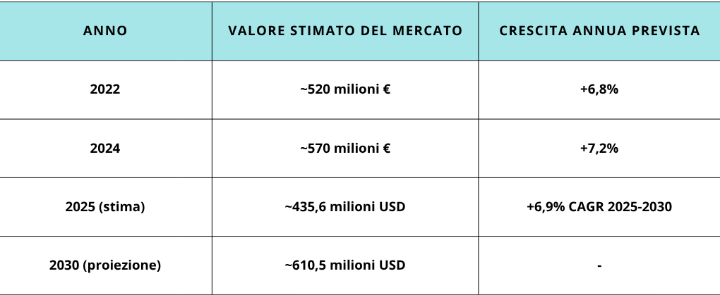 Negli ultimi anni il mercato dei probiotici in Italia ha registrato un’espansione costante. La tabella seguente sintetizza i valori stimati e le previsioni di crescita nel medio termine: