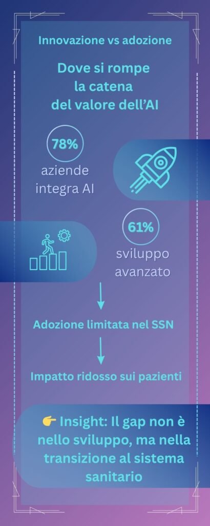 L’adoption gap non indica una carenza di innovazione, ma la distanza tra sviluppo tecnologico e utilizzo reale nel sistema sanitario. Nel caso dell’intelligenza artificiale, questo scarto emerge quando soluzioni già mature non riescono a essere integrate nei processi clinici e organizzativi.