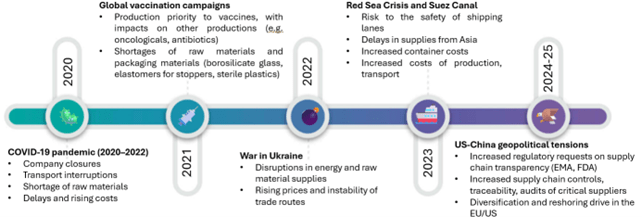 La pandemia di COVID-19 ha messo a dura prova la capacità produttiva e logistica mondiale. Le campagne vaccinali del 2021 hanno spostato risorse e priorità verso la produzione dei vaccini, rallentando quella di altri medicinali essenziali, come antibiotici e antitumorali [3]. Le difficoltà nel reperire materie prime e componenti di confezionamento, unite alle chiusure temporanee di mercati strategici come la Cina, hanno mostrato la fragilità delle catene di approvvigionamento globali, spingendo l’Europa a ripensare le proprie strategie produttive.