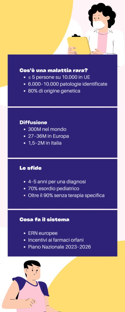 In Italia, la traiettoria recente combina norma e programmazione. La Legge 175 del 2021 ha esplicitato l’obiettivo di tutelare il diritto alla salute delle persone con malattie rare, intervenendo su uniformità dell’erogazione, rete, ricerca e farmaci orfani.
